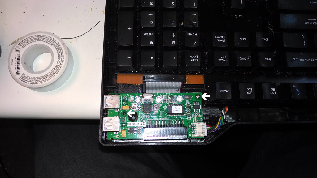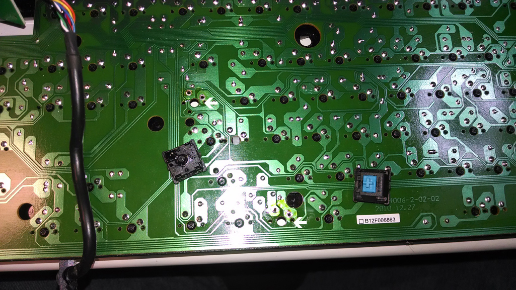 At this point the hard part is over.  Using some resin and desolder braid, it is pretty easy to unsolder the keys from the main PCB of the keyboard.  Getting the keys off the PCB takes a bit of work, because there are some clips on the font side that you just have to pry a little, and pushing the center pin on the back side will eventually pop the key right off the board.  The arrows show where the keys were originally: